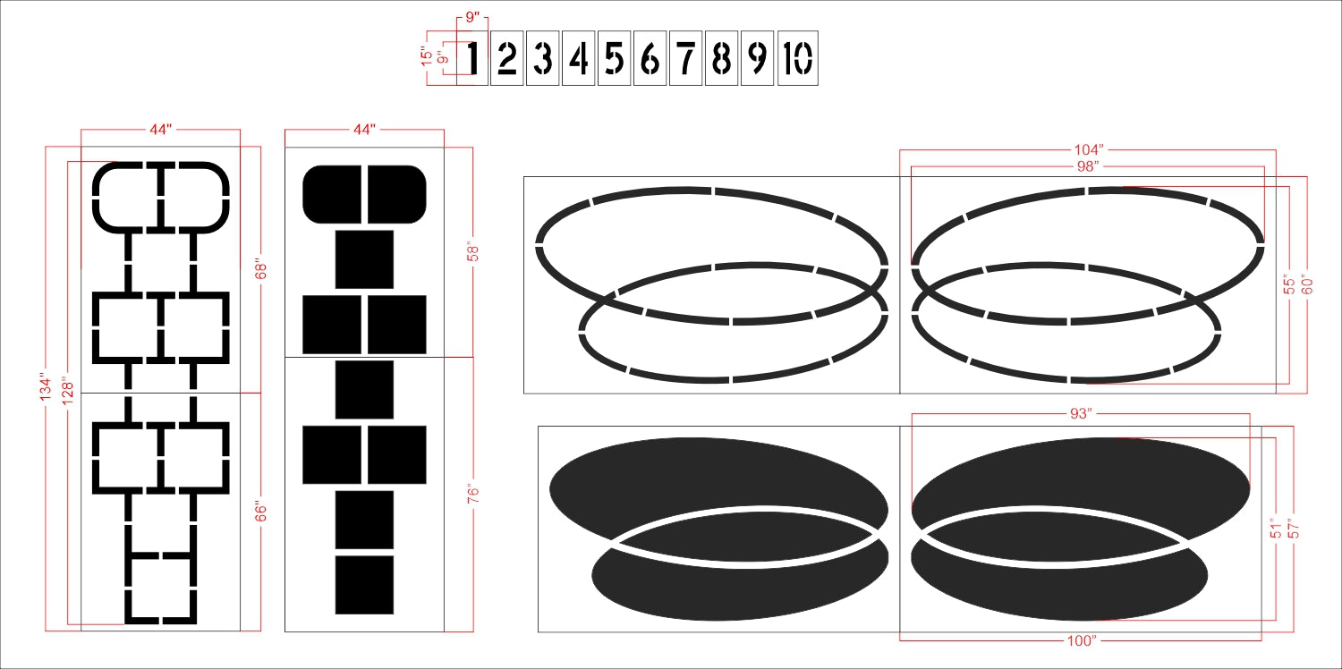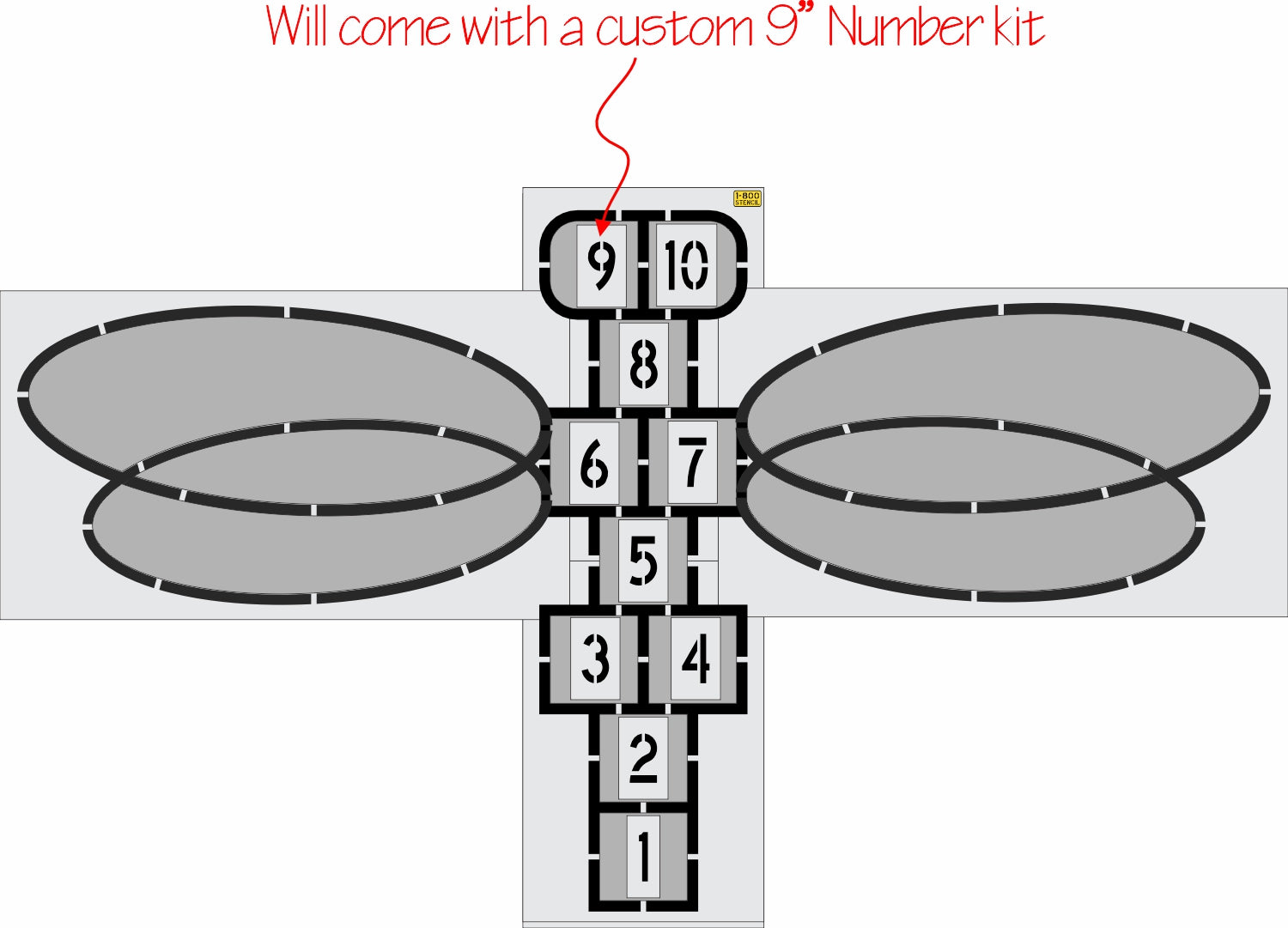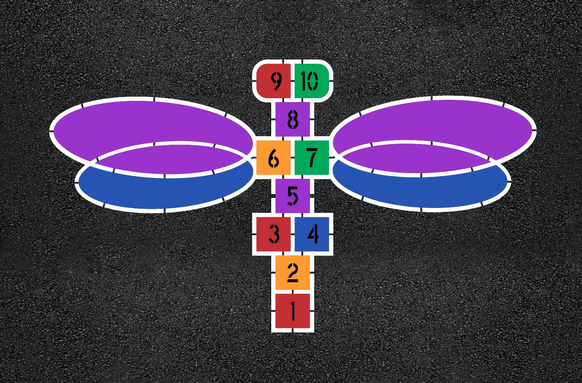 Calling all schools and playground enthusiasts! Transform your playground into a vibrant and engaging space with our 128 by 202 inch "Dragonfly Hopscotch" Stencil! With our wide selection of playground stencils, you can bring your school playground to life. From hopscotch and animal tracks to educational games, our stencils offer endless possibilities to foster active play and learning. Our playground stencils are specifically designed with schools in mind, meeting safety standards and encouraging physical activity, social interaction, and imagination. All 1-800-Stencil’s are professional quality and made from either Light or Pro-Grade LDPE, Aluminum, or optional UHMW plastic to all last for years of professional use.