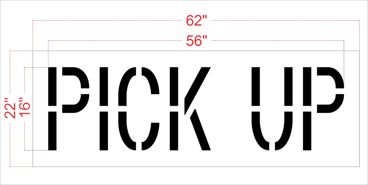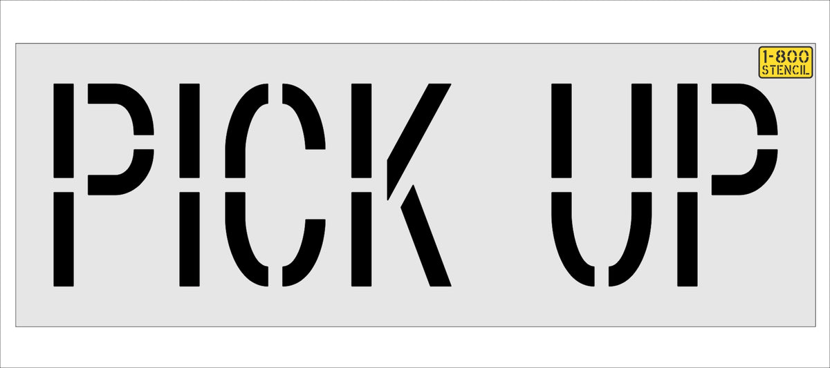 The 16 inch "PICK UP" Stencil is perfect for use in parking lots to indicate where you may need to go to pick up. This stencil has a standard 3" overspray to ensure clean markings. It is very easy to clean and reuse, so don't worry about having to buy a new one every painting job you have. All 1-800-Stencil’s are professional quality and made from either Light or Pro-Grade LDPE, Aluminum, or optional UHMW plastic to all last for years of professional use.