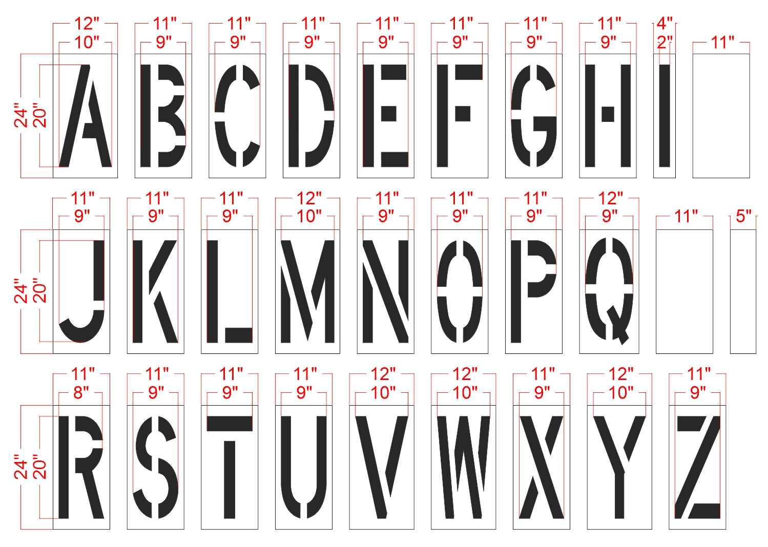 The 20 by 9 inch Alphabet / Letter stencil set shown here is designed to be easy to use. There is 1" of space on each letter so that butting them together will provide a perfect 2" spacing (industry standard spacing). The 20"" height is of the actual letters and the material is 24" tall, this set is perfect for stenciling uncommon words and single letters on parking lots, parking garages, sidewalks, and more. The 29 piece set includes A-Z, 2 blanks, and 1 spacer. The 38 piece kit has an extra A, C, E, I, N, O, R, S to make it easier to paint common wording that goes in a parking lot. All 1-800-Stencil’s are professional quality and made from either Light or Pro-Grade LDPE, Aluminum, or optional UHMW plastic to all last for years of professional use.