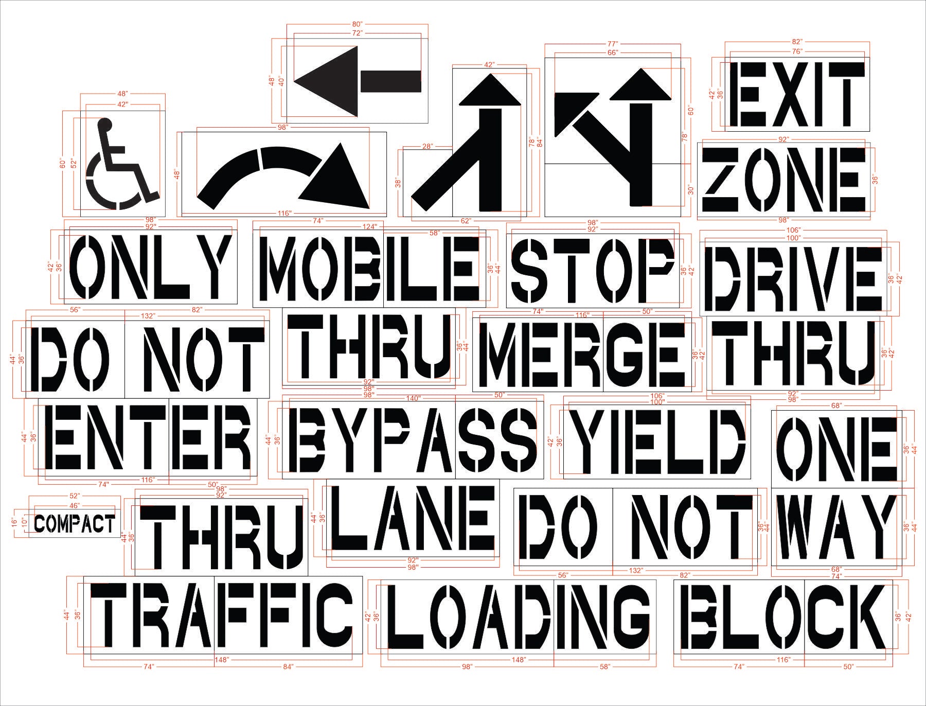 This Chick Fil A stencil kit contains all of the Chick Fil-A required stencils to their newest specifications, and is designed to be used on flat surfaces such as a parking lot or on a sign to make the area safer for both pedestrians and drivers. The materials we use at 1-800 Stencil are Substantial and Eco-friendly. All 1-800-Stencil’s are professional quality and made from either Light or Pro-Grade LDPE, Aluminum, or optional UHMW plastic to all last for years of professional use.