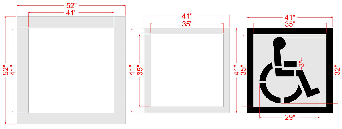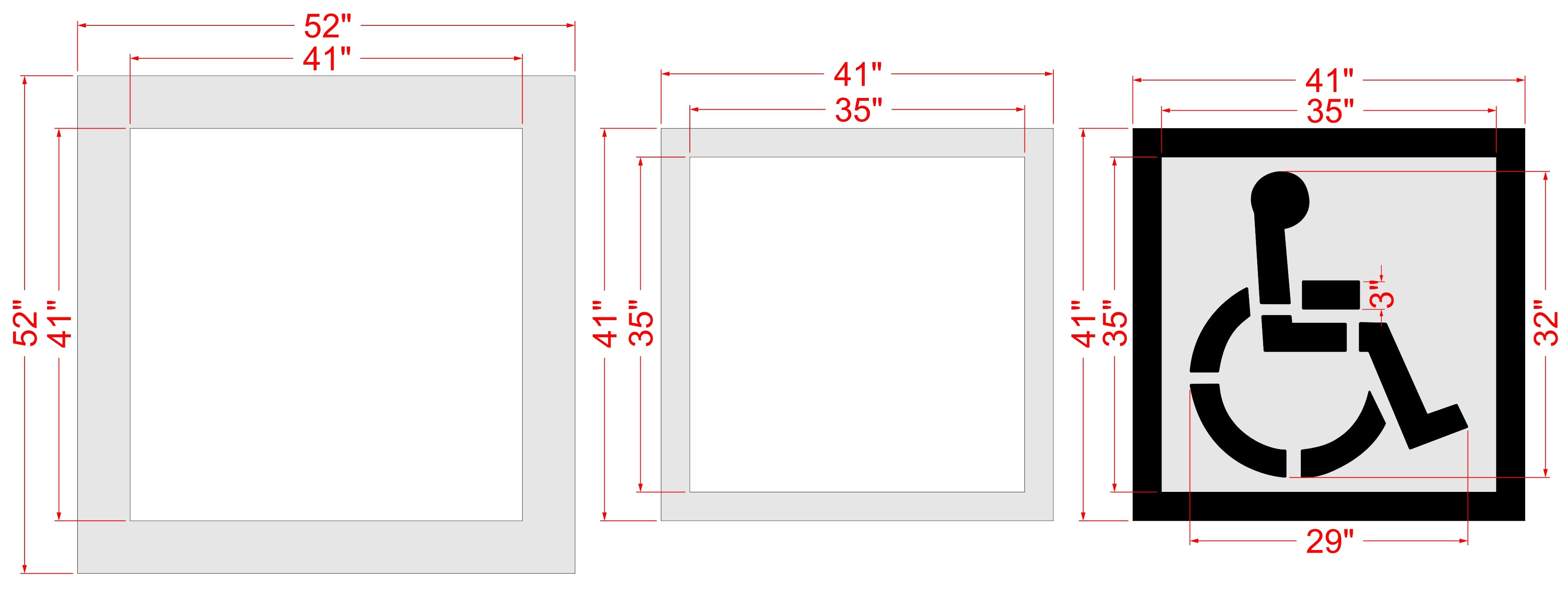 The 32 inch Handicap Stencil is a medium (3-piece) handicap with a 41 inch square solid border and a 41 inch background, that meets ADA (Americans with Disabilities Act) standards and some state/ local standards. This 32 inch Handicap Stencil is good for small handicap marking areas when it meets the state and local standards. All 1-800-Stencil’s are professional quality and made from either Light or Pro-Grade LDPE, Aluminum, or optional UHMW plastic to all last for years of professional use.