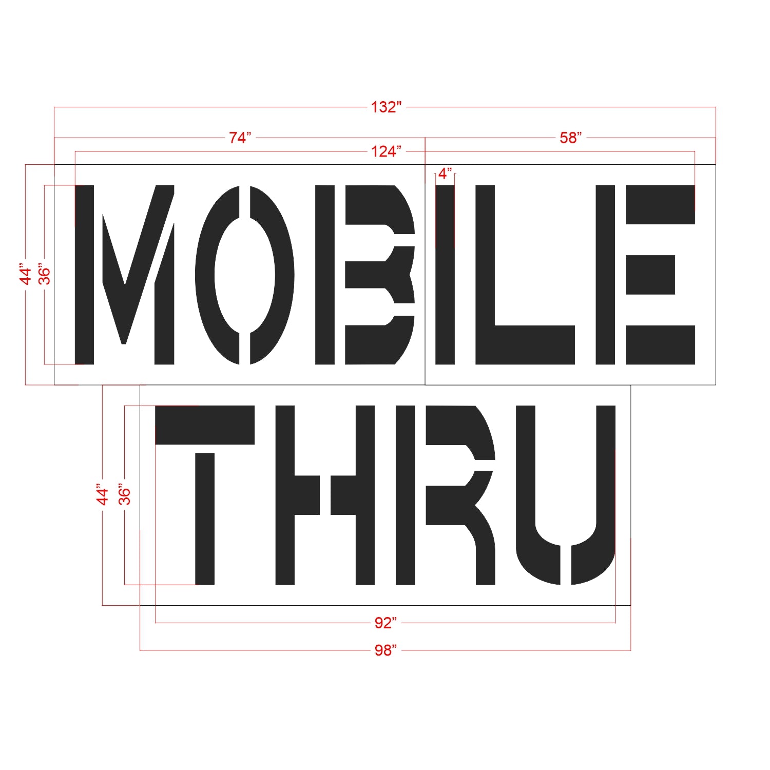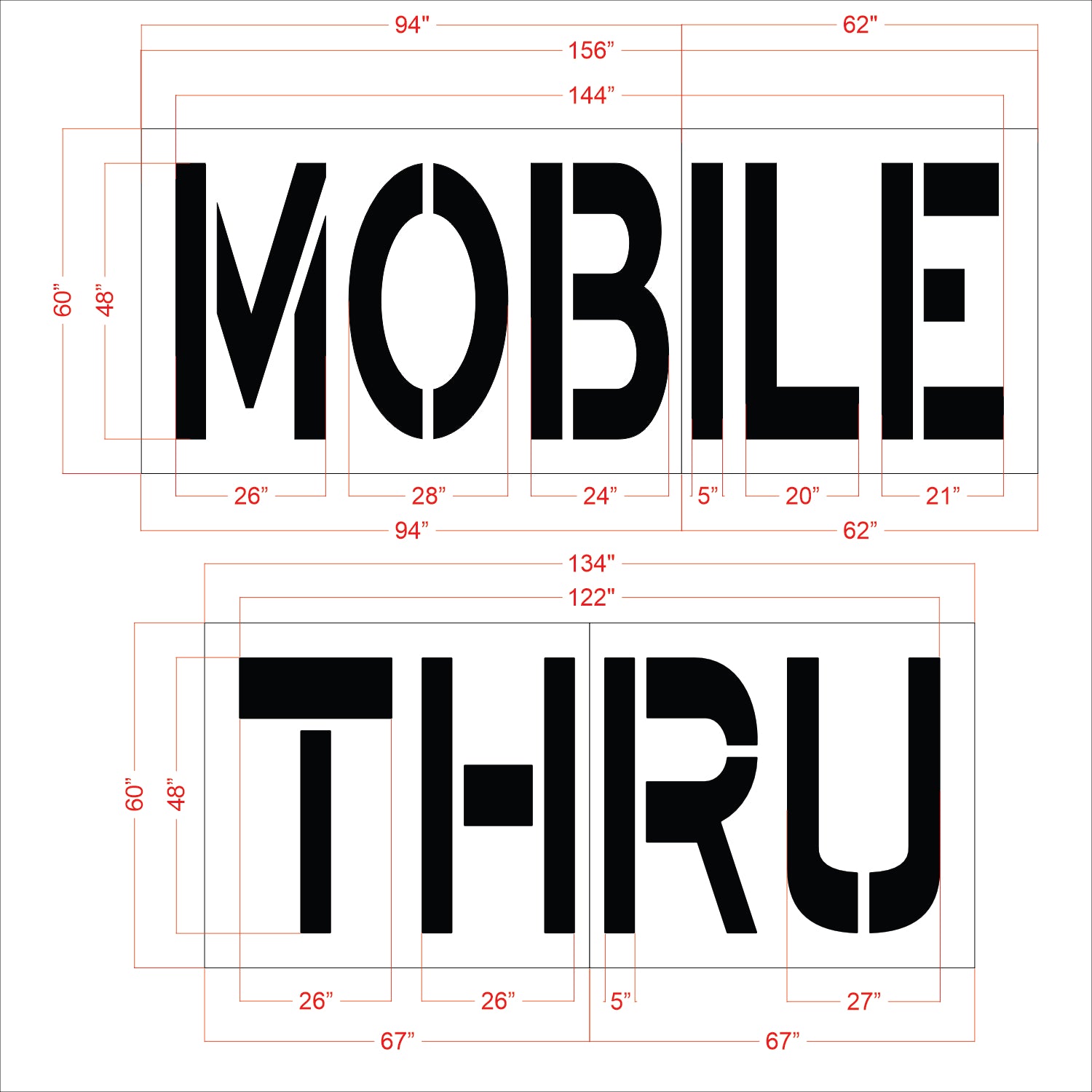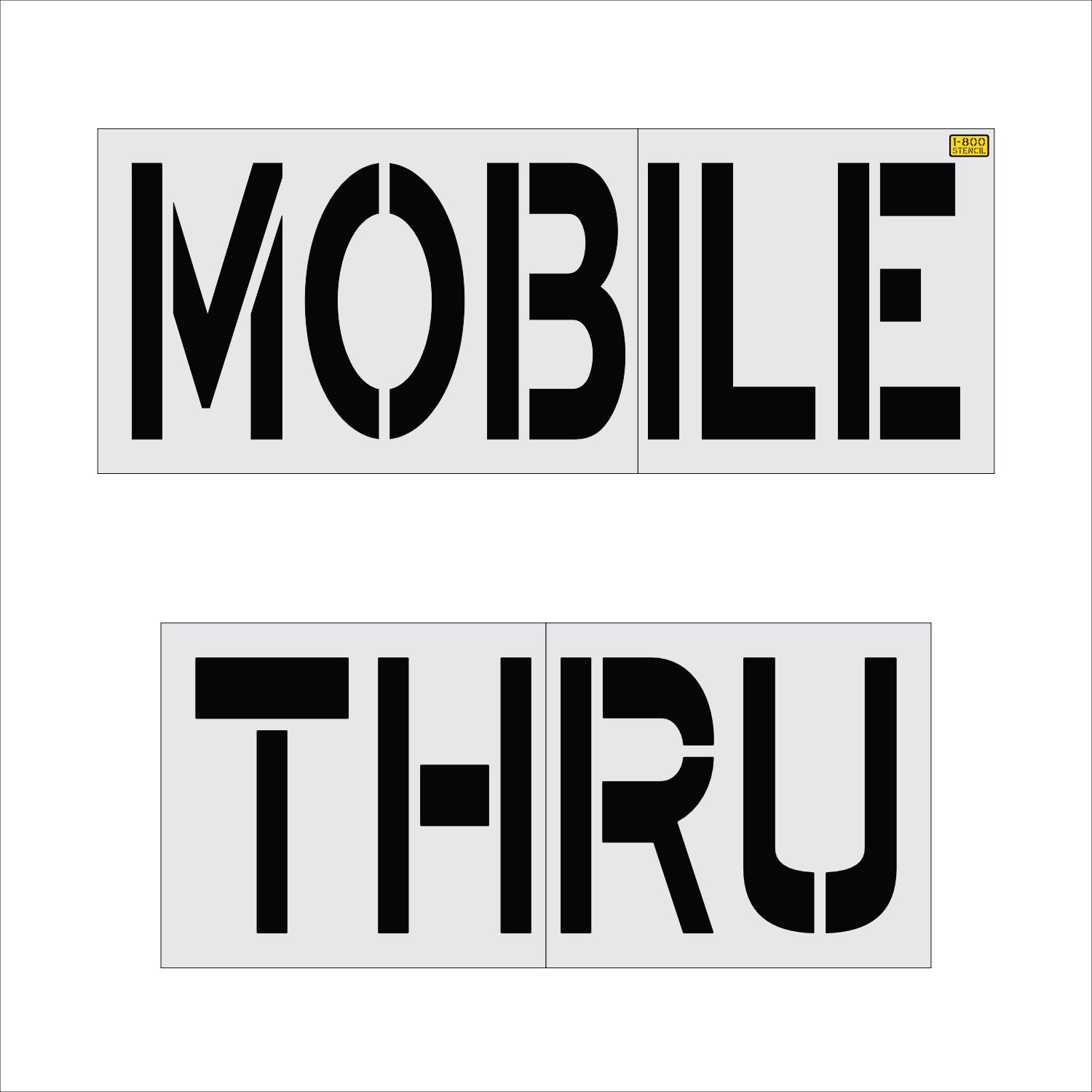 This 36 inch Chick-Fil-A MOBILE THRU stencil is designed to meet Chick-Fil-A's most updated specifications, perfect for practicing safety regulations to any Chick-Fil-A branch. Made from high quality and durable materials. Cut precisely to create well-defined markings suited for your brand. This stencil is specifically made for Chick-Fil-A roadways, joints, and premises to direct and guide Chick-Fil-A customers. All 1-800-Stencil’s are professional quality and made from either Light or Pro-Grade LDPE, Aluminum, or optional UHMW plastic to all last for years of professional use.