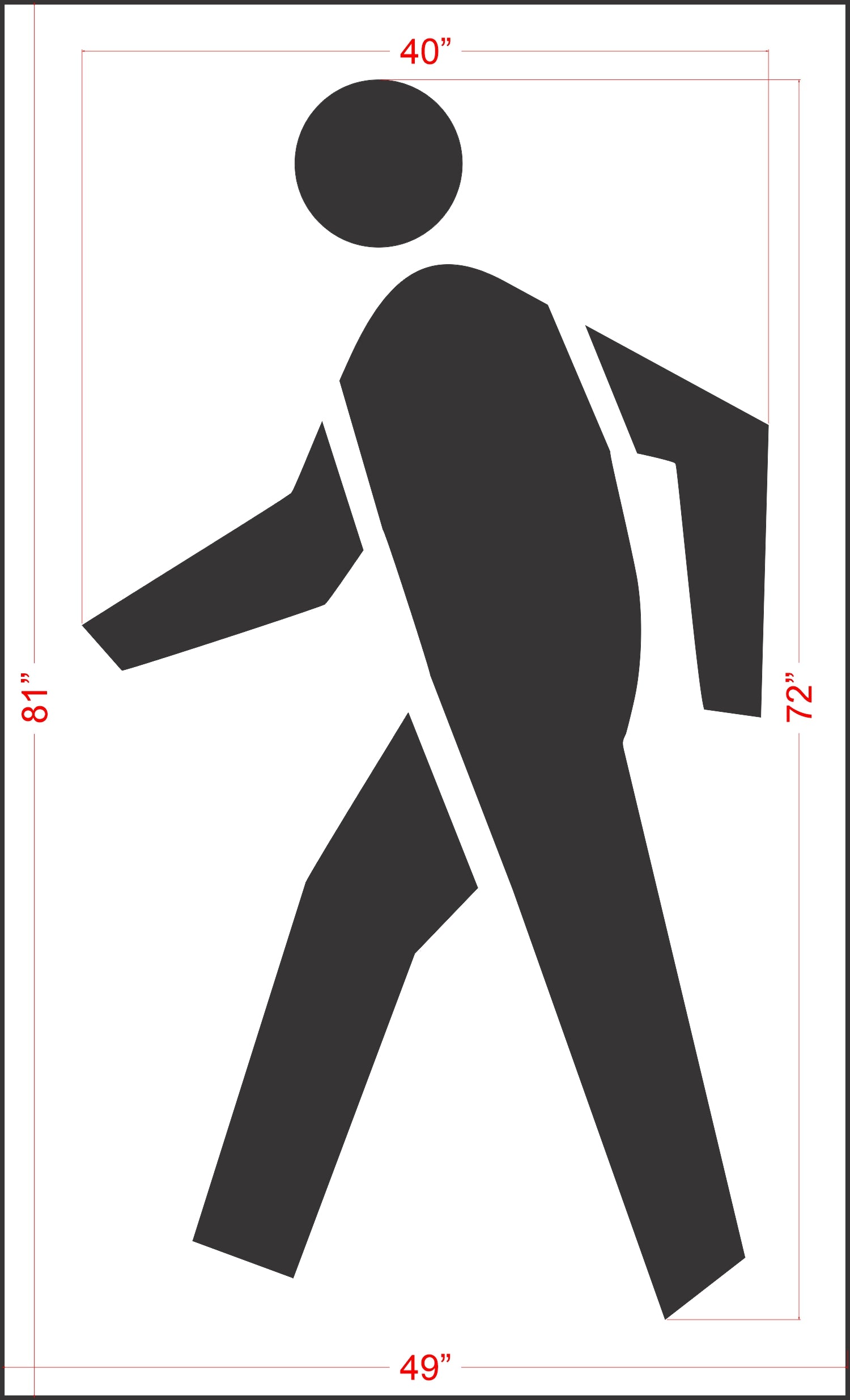 The 48 inch New York DOT Pedestrian Symbol stencil is a good size for walkways and pathways where size is a concern because the width of the stencil is only 27". This 48" Pedestrian Symbol stencil comes with our standard 3" of overspray. This stencil is made specifically to meet the specifications for the Department of Transportation's Manual on Uniform Traffic Control Devices or MUTCD.