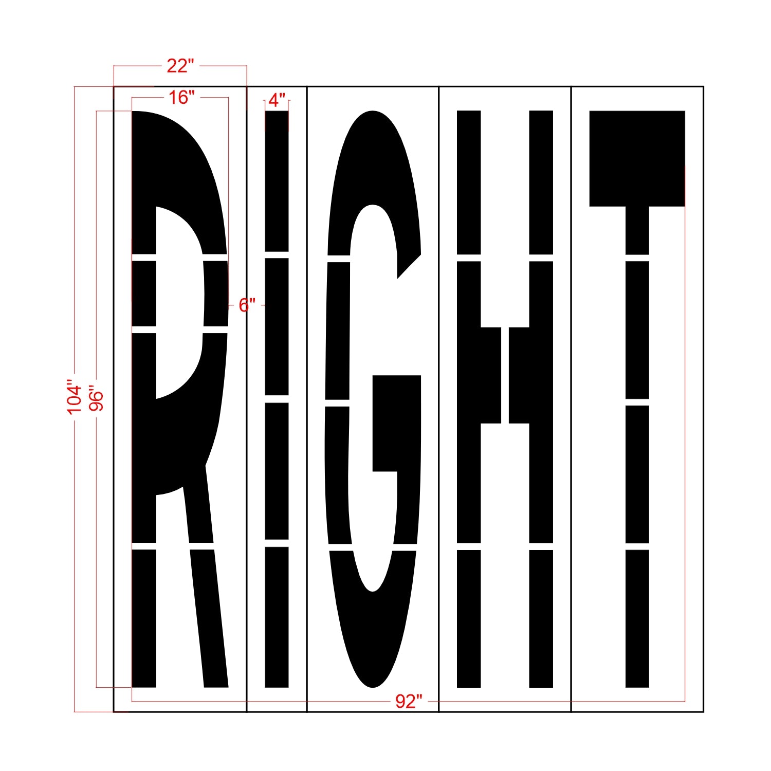 The 96 inch Florida DOT "RIGHT" stencil is great for painting along large parking lots and roadways. This stencil is made specifically to meet the specifications for the Department of Transportation's Manual on Uniform Traffic Control Devices or MUTCD. All 1-800-Stencil’s are professional quality and made from either Light or Pro-Grade LDPE, Aluminum, or optional UHMW plastic to all last for years of professional use.