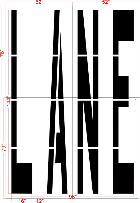 This 144" Georgia DOT LANE Stencil can be used for large projects like highways or roads. The stroke for each of the letters is 4" wide, and they all have a distance of 12" between them. Each of the characters is 16" wide. The flexibility of the stencil material allows it to be stored just about anywhere and be cleaned very easily. These 144" Stencils is made specifically to meet the specifications for the Department of Transportation's Manual on Uniform Traffic Control Devices or MUTCD.